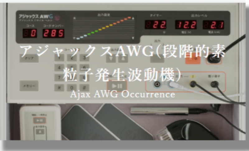 アジャックスAWG療法とは、段階的素粒子発生波動機で、人間のからだによいとされている125種類の周波数だけを使い、組み合わせによるコードをベースにして1秒間に6京2500兆の素粒子の束を照射し、ウイルス・細菌・寄生虫の破壊やからだのずれた機能を戻す、また、細胞組織の低下した能力を引き上げる根本療法です。